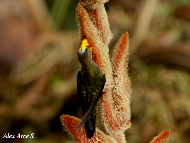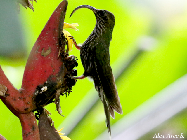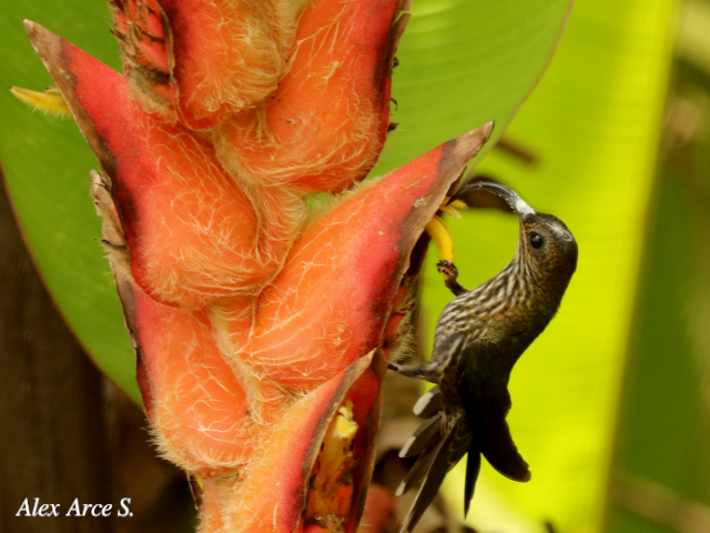 En las fotos se puede observar como se alimenta de las flores de Heliconia longa y Heliconia velligera