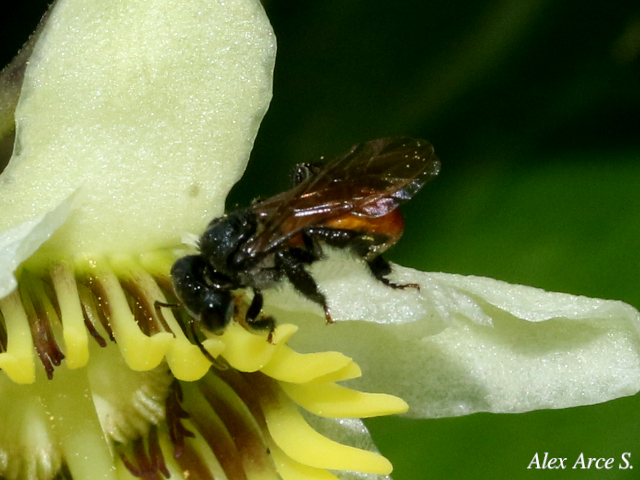 Es negra con el abdomen rojizo o café. Abdomen un poco más angosto que el tórax, de forma trigónal. Mide cerca de 7 mm de largo. El horario de visita a las flores ocurre entre 08:00 y 09:00 h. Esta abeja presenta otro comportamiento para obtener el polen, recolecta los granos que se encuentran caídos sobre los pétalos de las flores por la acción de otras abejas.