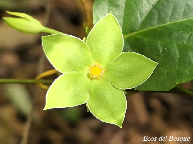Planta rastrera o ascendente, hasta al menos 3 m, las partes leñosas aparentemente sin corcho. Hojas con el pecíolo a veces rojizo, lámina verde elíptica, truncada a redondeada. Flores con los sépalos verdes a crema, ovados a elípticos, agudos en el ápice, con esparcidos tricomas cortos y glandulares abaxialmente. Folículos verdes, amplios y asimétricos en la base, atenuados en el ápice, aparentemente glabros; semillas café claro a oscuro, 4la coma blanca. (1)