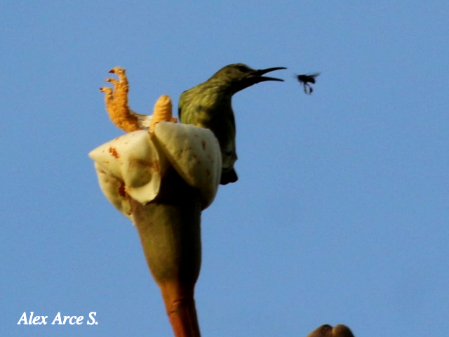 En las fotos se observa a la especie alimentandose de las flores de balsa (Ochroma pyramidale)