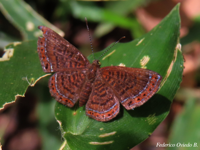La especie se distribuye desde el sur de México hasta el Ecuador. (1)  Los miembros de su familia (RIODINIDAE) es tal vez de los que se sabe menos de su biología, ecología y sistemática; posiblemente se debe a que los imagos son de actividad restringida y pasan la mayor parte de su etapa adulta contiguas al dosel de los bosques tropicales. Muchas especies están limitadas temporal y espacialmente. Su distribución geográfica es discontinua, circunscritas principalmente a bosques tropicales (primarios o secundarios), aunque algunas especies se localizan en ambientes áridos o semiáridos: diversos tipos de matorrales y selvas bajas caducifolias; muy pocas especies son de alta montaña.(2)
