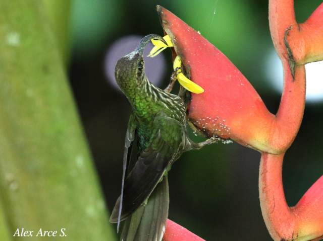 En las fotos se puede observar como se alimenta de las flores de Heliconia longa y Heliconia velligera