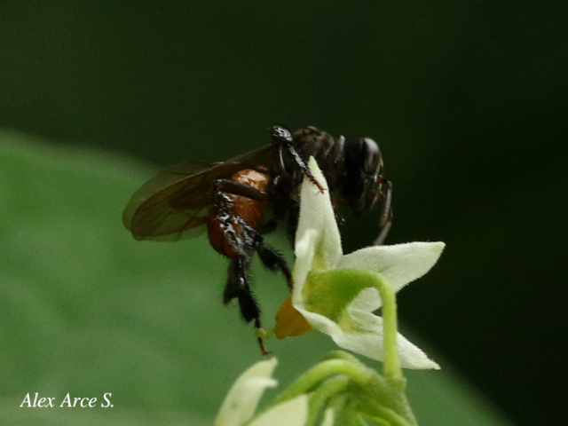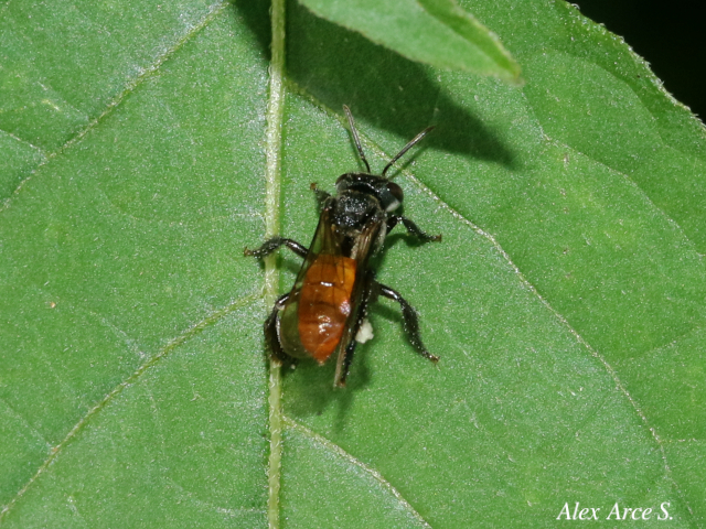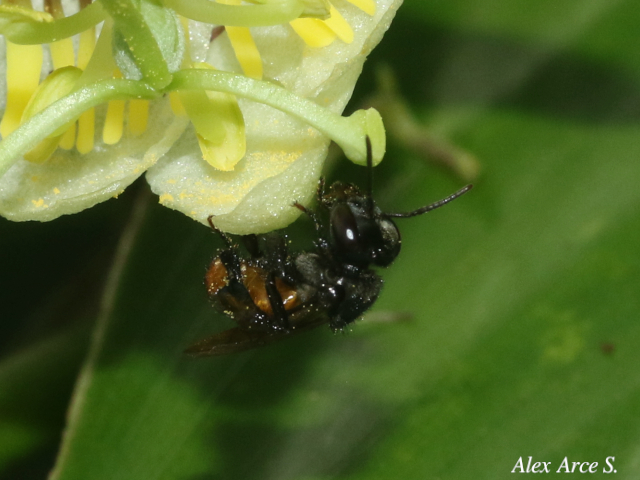 Es negra con el abdomen rojizo o café. Abdomen un poco más angosto que el tórax, de forma trigónal. Mide cerca de 7 mm de largo. El horario de visita a las flores ocurre entre 08:00 y 09:00 h. Esta abeja presenta otro comportamiento para obtener el polen, recolecta los granos que se encuentran caídos sobre los pétalos de las flores por la acción de otras abejas.