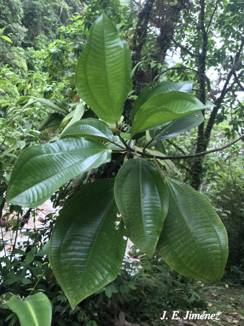 Arbusto o árbol, hasta 15 m. Hojas ovadas a elípticas, palmadamente 5-nervadas o (más comúnmente) 5-plinervadas. Flores con pétalos 7–10, blancos. Frutos 14–18 mm de diám.; semillas angostamente elipsoides y aplanadas en un extremo. (1)