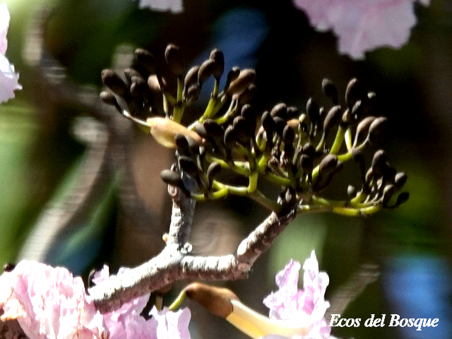 Sus amplias exhibiciones florales atraen abejas grandes como Eulaema, Centris, Euglosssa y Bommbus, que abren la flor con fuerza para llegar al nectario, de la misma forma que lo hacen en el cortez amarillo, y al igual que en este, las abejas hembra pueden recolectar polen y transportarlo  en sus patas. También en esta especie como en otras Bignoniáceas la base de la corola de las flores muestran perforaciones por el robo de néctar de las abejas Xylocopa y Trigona.(3)