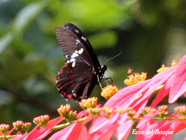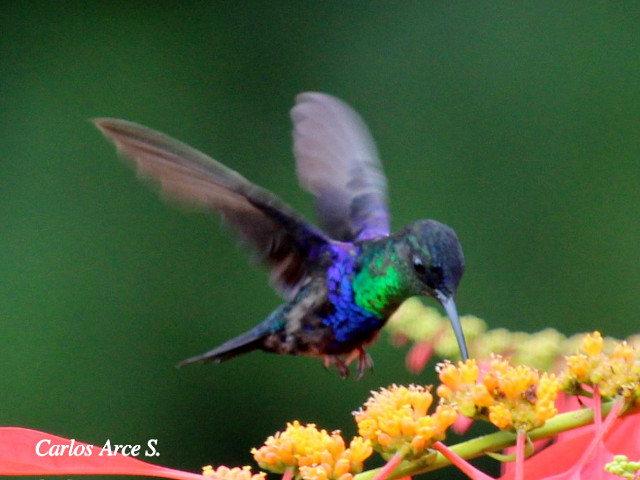 Su inflorescencia viene acompañada de brácteas (hojas modificadas de cuyas axilas nacen las flores) de color rojo vivo que contrastan con el verdor de la planta. Es un gran productor de néctar para colibríes e insectos. (2)